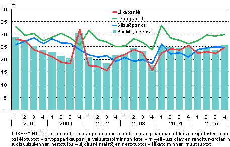 Vuonna 2004 huimasti kasvaneiden kotimaisten pankkien liikevoittojen kasvu jatkui myös vuonna 2005. Liikevoitto vuonna 2005 kasvoi 23 prosenttia edellisestä vuodesta päätyen 1 997 miljoonaan euroon. Liikepankkien osuus liikevoitosta oli 73,3 prosenttia, osuuspankkien 21,8 prosenttia ja säästöpankkien 4,9 prosenttia. Kotimaisten pankkien liikevoitto muodostui tasaisesti kunkin vuosineljänneksen aikana niin, että viimeisellä vuosineljänneksellä voittoa kertyi hieman enemmän kuin millään vuoden aikaisemmalla neljänneksellä. Tiedot ilmenevät Tilastokeskuksen luottolaitosten tuloslaskelmia ja taseita koskevista tiedoista.