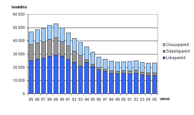Kotimaisten pankkien henkilökunnan määrä vuoden 2005 lopussa oli noin 23 000 henkilöä. Hieman yli 40 prosenttia pankkien henkilöstöstä työskenteli Uudellamaalla. Pankkien henkilökunnan määrässä ei juurikaan tapahtunut muutosta edelliseen vuoteen verrattuna. Sen sijaan verrattuna 90-luvun alun tilanteeseen pankkien henkilökunnan määrä on vähentynyt voimakkaasti. Huippuvuodesta 1989 henkilökunnan vähennys on ollut 56 prosenttia. Tiedot ilmenevät luottolaitosten tilinpäätösten liitetiedoista.