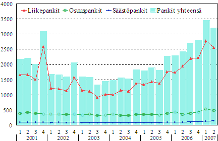Kotimaisten pankkien liikevaihto neljännesvuosittain vuosina 2001-2007