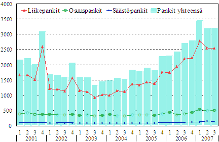 Kotimaisten pankkien liikevaihto neljännesvuosittain vuosina 2001-2007