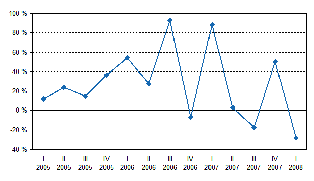 Kotimaisten pankkien liikevoiton vuosimuutos neljänneksittäin vuodesta 2004 alkaen, %