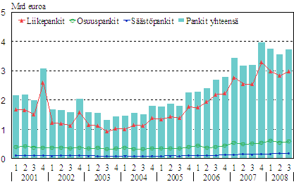 Kotimaisten pankkien liikevaihto neljännesvuosittain vuosina 2001-2008