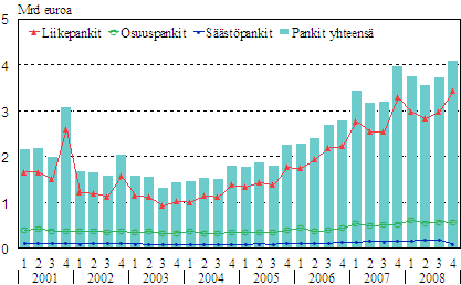 Kotimaisten pankkien liikevaihto neljännesvuosittain vuosina 2001-2008