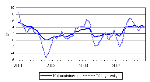 Maarakennusalan kaikkien kustannusten sekä päällystystöiden kustannusten vuosimuutokset 1/2001 - 11/2004