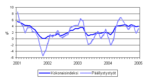 Maarakennusalan kaikkien kustannusten sekä päällystystöiden kustannusten vuosimuutokset 1/2001 - 1/2005