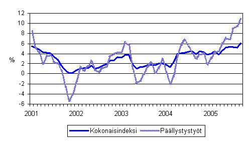 Maarakennusalan kaikkien kustannusten sekä päällystystöiden kustannusten vuosimuutokset 1/2001 - 9/2005