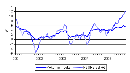 Maarakennusalan kaikkien kustannusten sekä päällystystöiden kustannusten vuosimuutokset 1/2001 - 10/2005