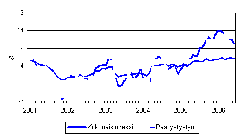 Maarakennusalan kaikkien kustannusten sekä päällystystöiden kustannusten vuosimuutokset 1/2001 - 6/2006