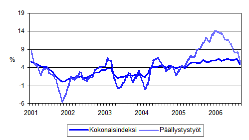 Maarakennusalan kaikkien kustannusten sekä päällystystöiden kustannusten vuosimuutokset 1/2001 - 9/2006
