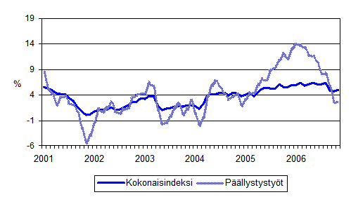 Maarakennusalan kaikkien kustannusten sekä päällystystöiden kustannusten vuosimuutokset 1/2001 - 11/2006