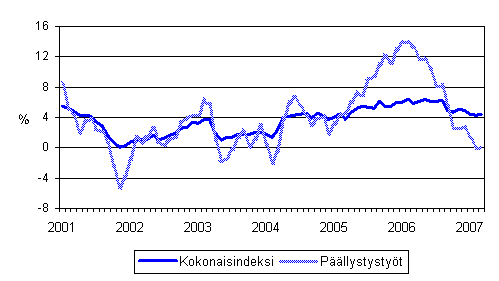 Maarakennusalan kaikkien kustannusten sekä päällystystöiden kustannusten vuosimuutokset 1/2001 - 3/2007