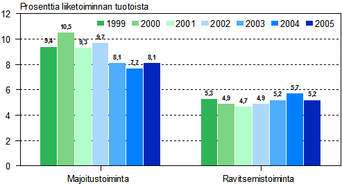 Majoitus- ja ravitsemistoiminnan 10 200 yritystä keräsivät Tilastokeskuksen mukaan liikevaihtoa 4,5 miljardia euroa ja työllistivät 49 200 henkilöä vuonna 2005. Jalostusarvoa majoitus- ja ravitsemistoiminnassa kertyi 1,7 miljardia euroa, mikä oli 40 miljoonaa euroa enemmän kuin vuotta aiemmin. Henkilöä kohden laskettuna jalostusarvoa kertyi 34 000 euroa.