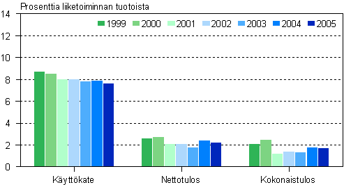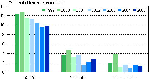 Kannattavuuden tunnusluvut heikkenivät hieman, paitsi myyntikate, joka kohosi vajaalla prosenttiyksiköllä. Käyttökatetta kertyi 234 miljoonaa euroa eli 6,9 prosenttia liiketoiminnan tuotoista. Toiminta tuotti voittoa 144 miljoonaa euroa, mikä oli 4,3 prosenttia tuotoista. Pk-yritysten myyntikate oli 58,4 prosenttia kun se suurilla oli 67 prosenttia liikevaihdosta. Käyttökatetta kummallekin sektorille kertyi 6,9 prosenttia liiketoiminnan tuotoista. Voittoa pk-sektori sai 5,5 prosenttia tuotoista, kun suurten voitto jäi 1,3 prosenttiin.