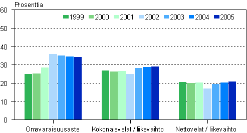 Toimialan omavaraisuusaste oli lähes 35 prosenttia taseesta kuten parina edellisenäkin vuonna. Kokonaisvelat suhteessa liikevaihtoon lisääntyivät 0,6 prosenttiyksiköllä ja olivat 37 prosenttia.