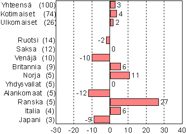 Yöpyneiden 10 tärkeintä lähtömaata, suluissa osuus