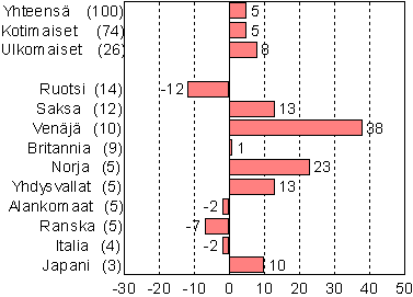 Ruotsalaiset olivat suurin ulkomaisten matkailijoiden ryhmä huhtikuussa hieman yli 30 000 yöpymisvuorokaudellaan, vaikka heidän yöpymisensä vähenivätkin 12 prosenttia viime vuodesta. Seuraavina olivat venäläiset 27 000 yöpymisellä ja saksalaiset 25 000 yöpymisellä. Venäläisten yöpymiset lisääntyivät peräti 38 prosenttia ja saksalaisten yöpymiset 13 prosenttia vuodentakaisesta. Myös norjalaisten yöpymiset lisääntyivät runsaasti, 23 prosenttia.