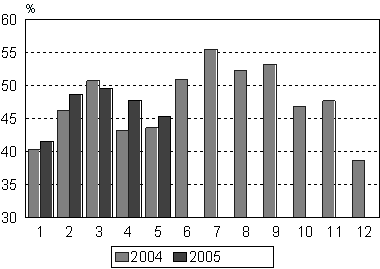 Yöpymiset kaikissa majoitusliikkeissä toukokuussa 2005 ja tammi-toukokuussa 2005 ja niiden vuosimuutokset, ennakkotieto