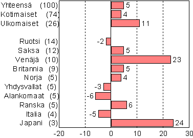 Tärkeimmistä Suomeen suuntautuvista matkailijamaista venäläisten ja japanilaisten yöpymiset lisääntyivät eniten lokakuussa. Venäläisten yöpymiset lisääntyivät Suomen majoitusliikkeissä 23 prosenttia ja japanilaisten yöpymiset 24 prosenttia. Myös saksalaisten, brittien ja ranskalaisten yöpymisissä oli 5 - 6 prosentin kasvu viime vuoden lokakuuhun verrattuna. Sitä vastoin hollantilaisten yöpymiset vähenivät vajaat 6 prosenttia ja italialaisten yöpymiset 4,5 prosenttia vuodentakaisesta.