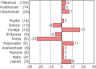 Tärkeimmistä Suomeen suuntautuvista matkailijamaista venäläisten ja yhdysvaltalaisten yöpymiset lisääntyivät eniten marraskuussa. Venäläisten yöpymiset lisääntyivät Suomen majoitusliikkeissä lähes 17 prosenttia ja yhdysvaltalaisten yöpymiset vajaat 11 prosenttia. Myös japanilaisten yöpymisissä oli 9 prosentin kasvu edellisvuoden marraskuuhun verrattuna. Sitä vastoin norjalaisten yöpymiset vähenivät peräti 23 prosenttia ja saksalaisten yöpymiset 8 prosenttia vuoden 2004 marraskuuhun verrattuna.
