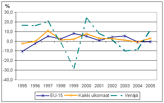Yöpymiset majoitusliikkeissä 1995-2005, vuosimuutos (%), kaikki ulkomaat, EU-15 ja Venäjä
