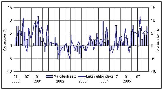Hotellien liikevaihtoindeksin ja hotelliyöpymisten vuosimuutokset (%) kuukausittain 2000-2005