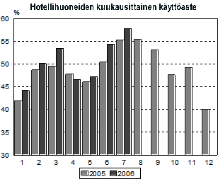 Hotellihuoneiden käyttöaste oli heinäkuussa 57,8 prosenttia. Vuotta aiemmin se oli 55,3 prosenttia. Maakunnista korkein huoneiden käyttöaste oli Etelä-Karjalassa, 72,2 prosenttia ja Varsinais-Suomessa, 71,9 prosenttia. Lappeenrannassa ja Turussa hotellihuoneista oli käytössä 81,4 prosenttia. Helsingin hotellihuoneiden käyttöaste oli 68 prosenttia.