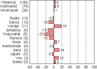 Tärkeimmistä Suomeen suuntautuvista matkailijamaista venäläisten, italialaisten, virolaisten ja norjalaisten yöpymiset lisääntyivät elokuussa. Venäläisten yöpymiset lisääntyivät 19 prosenttia, Italialaisten 14 prosenttia, virolaisten 12 prosenttia ja norjalaisten yöpymiset vajaat 7 prosenttia. Sitä vastoin yhdysvaltalaisten yöpymiset vähenivät 23 prosenttia ja brittien yöpymiset 15 prosenttia. Myös saksalaisten ja ranskalaisten yöpymisissä oli 12-13 prosenttia vähennystä vuodentakaisesta. Ruotsalaiset olivat suurin ulkomaisten matkailijoiden ryhmä elokuussa runsaalla 94 000 yöpymisvuorokaudellaan, vaikka vähennystä olikin vajaat 3 prosenttia viime vuoden elokuuhun verrattuna. Kaikkiaan majoitusliikkeissä kirjattiin ulkomaisten matkailijoiden yöpymisiä lähes 670 000 vuorokautta elokuussa 2006.