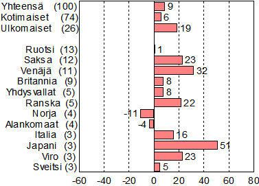 lisääntyivät eniten japanilaisten yöpymiset, 51 prosenttia.