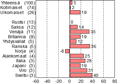 Tärkeimmistä Suomeen suuntautuvista matkailijamaista lokakuussa lisääntyivät eniten sveitsiläisten yöpymiset, 40 prosenttia. Venäläisten ja ranskalaisten yöpymisissä oli 35 - 36 prosentin kasvu. Virolaisten yöpymisiä kirjattiin 31 prosenttia viime vuotista enemmän. Myös italialaisten yöpymiset lisääntyivät huomattavasti, 28 prosenttia. Hollantilaisten yöpymiset lisääntyivät neljänneksen ja brittien sekä japanilaisten yöpymiset lähes viidenneksen viime vuoden lokakuuhun verrattuna. Suurimmista matkailijamaista ainoastaan norjalaisten yöpymiset vähenivät lokakuussa, 8 prosenttia.