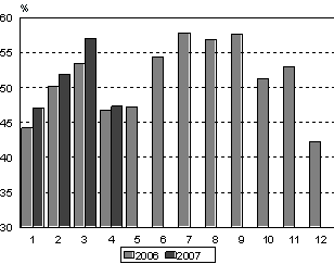 oli 4 prosenttia vuoden 2006 huhtikuuhun verrattuna. Kolmantena