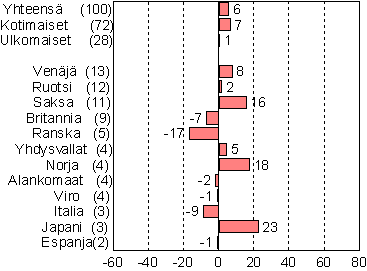 Venäläiset olivat suurin ulkomaisten matkailijoiden ryhmä lokakuussa 2007. He yöpyivät majoitusliikkeissä 40 000 kertaa. Määrä oli 8 prosenttia enemmän kuin vuotta aiemmin. Seuraavina olivat ruotsalaiset ja saksalaiset. Ruotsalaisille kirjattiin lähes 35 000 yöpymisvuorokautta ja saksalaisille hieman vajaat 31 000 vuorokautta. Ruotsalaisten yöpymiset lisääntyivät 2 prosenttia, kun taas saksalaisten yöpymisissä oli 16 prosentin lisäys viime vuodesta. Norjalaisten ja japanilaisten yöpymiset lisääntyivät myös voimakkaasti. Heille kirjattiin majoitusliikkeissä runsaat 10 000 yöpymistä kummallekin. Norjalaisten yöpymisiä tilastoitiin 18 prosenttia ja japanilaisten yöpymisiä 23 prosenttia enemmän kuin lokakuussa 2006.