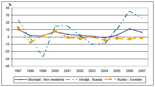 Yöpymiset majoitusliikkeissä 1997-2007, vuosimuutos (%), kaikki ulkomaat, Venäjä ja Ruotsi