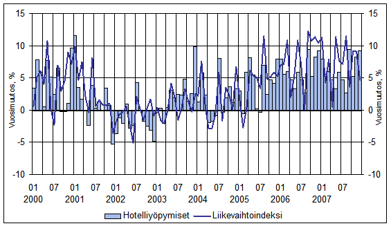 Hotellien liikevaihtoindeksin ja hotelliyöpymisten vuosimuutokset (%) kuukausittain 2000-2007