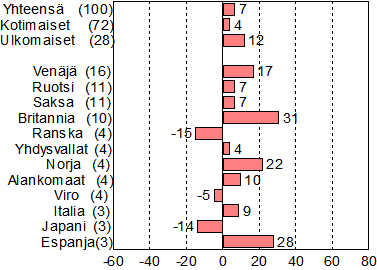 Yöpyneiden 12 tärkeintä asuinmaata, suluissa osuus