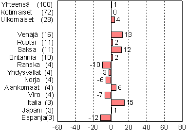 Ulkomaisten matkailijoiden yöpymiset Suomen majoitusliikkeissä vähenivät hieman kesällä 2008. Syyskuussa yöpymiset kääntyivät jälleen kasvuun ja niitä tilastoitiin 4 prosenttia enemmän kuin vuotta aiemmin. Venäläiset olivat suurin ulkomaisten matkailijoiden ryhmä syyskuussa. Heidän yöpymisensä lisääntyivät 13 prosenttia viime vuodesta ja niitä kirjattiin majoitusliikkeissä 48 000 vuorokautta. Seuraavana olivat ruotsalaiset lähes 46 000 yöpymisvuorokaudellaan. Määrä oli 2 prosenttia enemmän kuin vuotta aiemmin. Saksalaiset olivat kolmantena 43 000 yöpymisellä, mikä oli 12 prosenttia enemmän kuin syyskuussa 2007. Italialaisten yöpymiset lisääntyivät kuitenkin eniten; 15 prosenttia, ja yöpymisiä kertyi runsaat 10 000 vuorokautta. Sitä vastoin ranskalaisten ja espanjalaisten yöpymiset jäivät 10-12 prosenttia edellisvuotta pienemmiksi. Muiden tärkeimpien Suomeen suuntautuvien matkailijamaiden yöpymisten muutokset olivat alhaisempia.