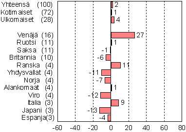 Venäläisten yöpymiset lisääntyivät eniten lokakuussa, 27 prosenttia ja he olivatkin odotetusti suurin ulkomaisten matkailijoiden ryhmä. Heille kirjattiin majoitusliikkeissä 51 000 yöpymisvuorokautta. Seuraavana olivat ruotsalaiset lähes 35 000 yöpymisvuorokaudellaan. Heidän yöpymisiään tilastoitiin prosentin enemmän kuin vuotta aiemmin. Saksalaiset olivat kolmantena 30 000 yöpymisellä, mikä oli prosentin vähemmän kuin lokakuussa 2007. Italialaisten ja ranskalaisten yöpymiset lisääntyivät 9 -11 prosenttia. Sitä vastoin yhdysvaltalaisten, virolaisten ja japanilaisten yöpymiset jäivät 11-13 prosenttia edellisvuotista pienemmiksi. Muiden tärkeimpien Suomeen suuntautuvien matkailijamaiden yöpymisten muutokset olivat vähäisempiä.