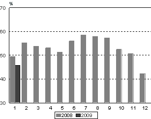 Ulkomaisten matkailijoiden yöpymisiä kirjattiin Suomen majoitusliikkeissä 540 000 vuorokautta tammikuussa 2009, mikä oli 4 prosenttia vähemmän kuin tammikuussa 2008. Yöpymisten kokonaismäärä väheni prosentin viime vuodesta ja yöpymisiä kirjattiin vajaat 1,3 miljoonaa vuorokautta. Sen sijaan kotimaisten matkailijoiden yöpymisissä oli prosentin lisäys vuoden 2008 tammikuuhun verrattuna. Luvut ovat Tilastokeskuksen majoitustilaston ennakkotietoja ja ne on kerätty majoitusliikkeiltä, joissa on vähintään 10 huonetta, mökkiä tai sähköpistokkeella varustettua matkailuvaunupaikkaa sekä retkeilymajoilta.