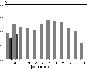 Tammi-helmikuussa Suomen majoitusliikkeissä yövyttiin 2,6 miljoonaa kertaa, mikä oli 5,5 prosenttia vähemmän kuin viime vuoden vastaavana ajanjaksona. Ulkomaisten matkailijoiden yöpymiset vähenivät 9 prosenttia ja niitä kirjattiin majoitusliikkeissä lähes 900 000 vuorokautta. Kotimaisten matkailijoiden yöpymiset vähenivät 4 prosenttia alkuvuonna 2009.