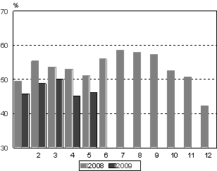 Tammi-toukokuussa 2009 yöpymiset vähenivät Suomen majoitusliikkeissä 6 prosenttia viime vuoden vastaavaan ajanjaksoon verrattuna. Yöpymisten kokonaismääräksi tilastoitiin 6,6 miljoonaa yöpymisvuorokautta. Kotimaisten matkailijoiden yöpymiset vähenivät 3,5 prosenttia ja ulkomaisten matkailijoiden yöpymiset 11 prosenttia edellisvuodesta. Yöpymisten kokonaismäärä kasvoi ainoastaan Ahvenanmaalla, 3,1 prosenttia ja Etelä-Savossa, 1,6 prosenttia.