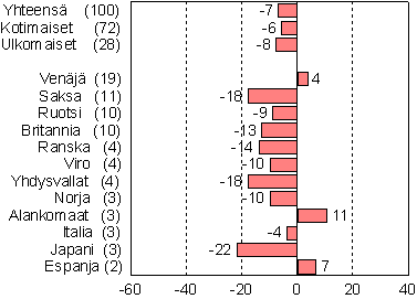 Yöpymiset majoitusliikkeissä ovat vähentyneet koko alkuvuoden ja vähenivät edelleen toukokuussa. Ainoastaan venäläisten, hollantilaisten ja espanjalaisten yöpymiset lisääntyivät viimevuodesta. Sitä vastoin kaikista muista tärkeimmistä Suomeen suuntautuvista matkailijamaista tulleiden matkailijoiden yöpymisiä kirjattiin majoitusliikkeissä vähemmän kuin vuotta aiemmin. Venäläiset ja ruotsalaiset olivat toukokuussa suurimmat ulkomaisten matkailijoiden ryhmät. Venäläisille tilastoitiin majoitusliikkeissä runsaat 53 000 yöpymisvuorokautta mikä oli 4 prosenttia enemmän kuin vuotta aiemmin. Ruotsalaiset yöpyivät 42 000 vuorokautta; vähennystä oli 9 prosenttia. Saksalaiset olivat kolmantena 33 000 yöpymisvuorokaudellaan. Heidän yöpymisensä vähenivät 18 prosenttia viimevuodesta. Suurin vähennys oli kuitenkin japanilaisten yöpymisissä, 22 prosenttia.