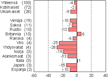 Yöpymiset Suomen majoitusliikkeissä ovat vähentyneet koko kuluvan vuoden ja sama suunta jatkui edelleen heinäkuussa. Ainoastaan brittien yöpymiset lisääntyivät viimevuodesta 6 prosenttia ja italialaisten yöpymiset säilyivät lähes edellisvuoden tasolla. Kaikista muista tärkeimmistä Suomeen suuntautuvista matkailijamaista tulleiden matkailijoiden yöpymisiä kirjattiin majoitusliikkeissä huomattavasti vuodentakaista vähemmän. Ruotsalaiset olivat suurin ulkomaisten matkailijoiden ryhmä lähes 116 000 yöpymisellään. Vähennystä viimevuodesta oli kuitenkin 12 prosenttia. Venäläiset olivat seuraavana ja heille tilastoitiin majoitusliikkeissä vajaat 95 000 yöpymisvuorokautta, mikä oli 10 prosenttia vähemmän kuin vuotta aiemmin. Kolmantena olivat saksalaiset 85 000 yöpymisellään, mikä oli 7 prosenttia vähemmän kuin vuotta aiemmin. Eniten vähenivät kuitenkin yhdysvaltalaisten (-28%) ja virolaisten (-25%) yöpymiset. Myös norjalaisten yöpymiset vähenivät voimakkaasti. He yöpyivät lähes viidenneksen vähemmän kuin heinäkuussa 2008.