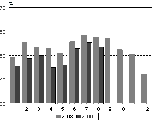 Vuoden 2009 tiedot eivät ole vertailukelpoisia vuoden 2008 vastaavan ajanjakson tietoihin, koska eräiden keskusten varausjärjestelmäuudistusten yhteydessä tilastointimenetelmä on muuttunut.