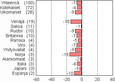 Matkailijoiden yöpymiset Suomen majoitusliikkeissä vähenivät edelleen marraskuussa 2009. Lähes kaikista tärkeimmistä Suomeen suuntautuvista matkailijamaista tulleiden matkailijoiden yöpymisiä kirjattiin majoitusliikkeissä marraskuussa huomattavasti edellisvuotista vähemmän. Venäläiset olivat suurin ulkomaisten matkailijoiden ryhmä lähes 62 000 yöpymisellä, vaikka vähennystä olikin 15 prosenttia edellisvuoteen verrattuna. Saksalaiset ja ruotsalaiset olivat seuraavina ja heille tilastoitiin kummallekin 27 000 yöpymisvuorokautta. Saksalaisten yöpymiset vähenivät prosentin ja ruotsalaisten yöpymiset 9 prosenttia. Myös norjalaisten yöpymisissä oli huomattava 16 prosentin vähennys vuoden 2008 marraskuuhun verrattuna. Yhdysvaltalaisten ja espanjalaisten yöpymiset vähenivät 9-10 prosenttia edellisvuodesta.