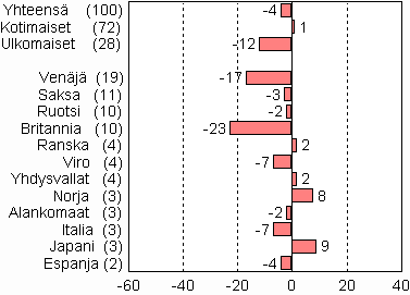 Yöpymiset Suomen majoitusliikkeissä vähenivät kuukausittain koko vuoden 2009, eikä joulukuu tehnyt poikkeusta. Pientä kasvua oli kuitenkin havaittavissa maittaisten yöpymisten määrissä joulukuussa 2009. Norjalaisten ja japanilaisten yöpymiset lisääntyivät 8-9 prosenttia edellisvuodesta. Myös ranskalaisten ja yhdysvaltalaisten yöpymisissä oli 2 prosentin lisäys kummallekin. Suomeen suuntautuva matkailu väheni kaikista muista tärkeimmistä matkailijamaista edellisvuoteen verrattuna. Britit olivat joulukuussa suurin ulkomaisten matkailijoiden ryhmä 108 000 yöpymisellään. Vähennystä edellisvuodesta oli kuitenkin 23 prosenttia. Venäläiset olivat seuraavana ja heille tilastoitiin majoitusliikkeissä lähes 101 000 yöpymisvuorokautta; määrä oli 17 prosenttia vähemmän kuin vuotta aiemmin. Kolmantena olivat saksalaiset runsaalla 26 000 yöpymisellään, mikä oli 3 prosenttia vähemmän kuin vuoden 2008 joulukuussa.