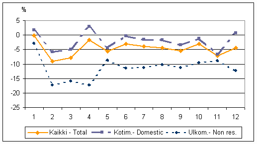 | Ulkomaat - Non-residents | 4 890 006 | -11,1 | 4 106 876 | -12,2 |