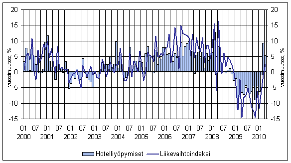 Hotellien liikevaihtoindeksin ja hotelliyöpymisten vuosimuutokset (%) kuukausittain, vuoden 2000 tammikuusta vuoden 2010 huhtikuuhun
