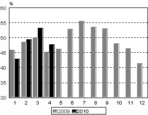 Venäläiset olivat suurin ulkomaisten matkailijoiden ryhmä huhtikuussa 2010. Heidän yöpymisiään kirjattiin Suomen majoitusliikkeissä 46 000 vuorokautta. Määrä oli lähes 16 prosenttia enemmän kuin vuotta aiemmin. Seuraavana olivat ruotsalaiset 30 000 yöpymisellä. Heidän yöpymisensä vähenivät vajaan prosentin. Saksalaiset olivat kolmantena ja he yöpyivät majoitusliikkeissä 24 000 kertaa, mikä oli vajaan prosentin enemmän kuin viime vuoden huhtikuussa. Eniten vähenivät brittien yöpymiset, peräti 34 prosenttia. Matkailu Ranskasta, Yhdysvalloista ja Alankomaista väheni 9-12 prosenttia sekä Italiasta ja Espanjasta 18 prosenttia. Sen sijaan matkailu kasvoi Virosta ja Norjasta. Virolaisten yöpymiset lisääntyivät lähes 22 prosenttia ja norjalaisten 4 prosenttia vuotta aiemmasta.