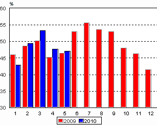 Ulkomaisten matkailijoiden yöpymisiä kirjattiin Suomen majoitusliikkeissä 320 000 vuorokautta toukokuussa 2010, mikä oli 4 prosenttia vähemmän kuin toukokuussa 2009. Sitä vastoin kotimaiset matkailijat yöpyivät majoitusliikkeissä lähes yhtä monta kertaa kuin vuotta aiemmin. Yöpymisten kokonaismäärä väheni prosentin viime vuodesta ja yöpymisiä kirjattiin kaikkiaan 1,2 miljoonaa vuorokautta toukokuussa 2010. Luvut ovat Tilastokeskuksen majoitustilaston ennakkotietoja ja ne on kerätty majoitusliikkeiltä, joissa on vähintään 10 huonetta, mökkiä tai sähköpistokkeella varustettua matkailuvaunupaikkaa sekä retkeilymajoilta.