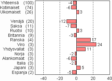 Saksalaiset olivat suurin ulkomaisten matkailijoiden ryhmä kesäkuussa runsaalla 65 000 yöpymisellä. Määrä oli kuitenkin lähes 7 prosenttia vähemmän kuin kesäkuussa 2009. Seuraavana olivat venäläiset 60 000 yöpymisellä ja vähennystä viime vuodesta oli 12 prosenttia. Kolmantena olivat ruotsalaiset 55 000 yöpymisellä. Heidän yöpymisiään kirjattiin majoitusliikkeissä 3 prosenttia enemmän kuin vuotta aiemmin. Tärkeimmistä Suomeen suuntautuvista matkailijamaista virolaisten yöpymiset lisääntyivät eniten; 24 prosenttia ja he yöpyivät lähes 16 000 kertaa kesäkuussa 2010. Myös ranskalaisten ja yhdysvaltalaisten yöpymiset lisääntyivät voimakkaasti. Ranskalaisten yöpymisiä tilastoitiin 17 prosenttia ja yhdysvaltalaisten yöpymisiä 11 prosenttia enemmän kuin vuotta aiemmin.