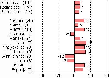 Ruotsalaiset olivat suurin ulkomaisten matkailijoiden ryhmä heinäkuussa 117 000 yöpymisellä. Määrä oli lähes 13 prosenttia enemmän kuin heinäkuussa 2009. Seuraavana olivat venäläiset 106 000 yöpymisellä ja lisäystä viime vuodesta oli 12 prosenttia. Kolmantena olivat saksalaiset runsaalla 88 000 yöpymisellä. Heidän yöpymisiään kirjattiin majoitusliikkeissä 5 prosenttia enemmän kuin vuotta aiemmin. Suomeen suuntautuva matkailu kaukomailta kasvoi myös voimakkaasti heinäkuussa. Aasiasta tulleiden matkailijoiden yöpymiset, joista japanilaisten osuus oli lähes 40 prosenttia, lisääntyivät 16 prosenttia vuodentakaisesta. Yhdysvaltalaisten, japanilaisten ja norjalaisten yöpymisissä oli 13-14 prosentin kasvu heinäkuussa 2010. Tärkeimmistä Suomeen suuntautuvista matkailijamaista virolaisten yöpymiset lisääntyivät eniten; 15 prosenttia ja he yöpyivät majoitusliikkeissä 23 000 kertaa.